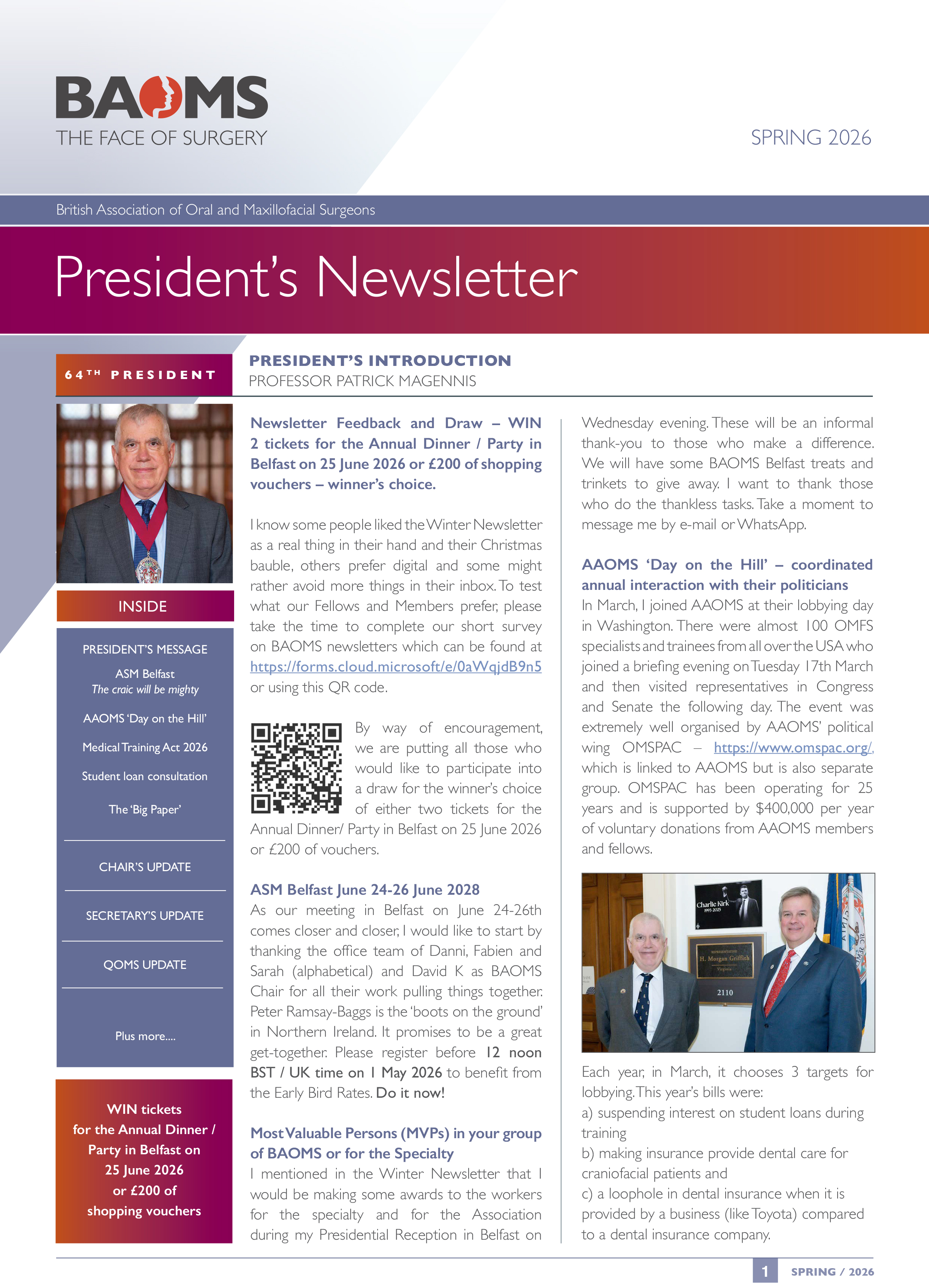 BAOMS Home About BAOMS Latest President's Newsletter Spring Newsletter 2026 Newsletter Feedback and Draw: WIN 2 tickets for the Annual Dinner / Party in Belfast on 25 June 2026 or £200 of shopping vouchers – winner’s choice. To find out more, please download the newsletter now. Professor Patrick Magennis Previous Presidents' Newsletters can be found in the Presidents' Newsletters archive About BAOMS Ilankovan About Face FundInclusion, Equity and DiversityJoin BAOMSMembership CategoriesApplicationWomen in OMFSLatest President's NewsletterHistory of BAOMSPresidents and Officers of the Association 1962-to dateCouncil 2026Council Sub-CommitteesNewsFinancial, Legal & OrganisationalContact Us Sponsors and partners