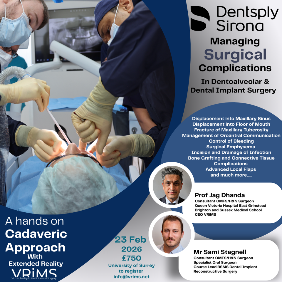 BAOMS Home Professionals News & Events Events Complications in Dentoalveolar and Dental Surgery with Cadaveric Approaches and Extended Reality Complications in Dentoalveolar and Dental Surgery with Cadaveric Approaches and Extended Reality Anatomy Department, Leggett Building, University of Surrey Medical School Download Event to Calendar Event Directions Cadaveric and extended reality approaches to common complications in dentoalveolar and dental implant surgery: Displacement into Maxillary Sinus Displacement into Floor of Mouth Fracture of Maxillary Tuberosity Management of Oroantral Communication Control of Bleeding Surgical Emphysema Incision and Drainage of Infection Bone Grafting and Connective Tissue Complications Advanced Local Flaps and much more...... A hands-on cadaveric approach with Extended Reality VRiMS Please see this flyer for further information Organised by: Professor Jag Dhanda & Mr Sami Stagnell of University of Surrey ← Other events FOR PROFESSIONALS Consultant informationOxford DeclarationCareers in OMFSQOMSQOMS reportsNCIP / GIRFTNational Oral and Maxillofacial Surgery Workforce CensusAwards, Grants & FellowshipsBAOMS Awards & PrizesBAOMS GrantsApply BAOMS grant Travel/ClinicalApply BAOMS grant ResearchApply BAOMS grant mini event mini projectsEACMFS Scholarships and awardsReports to the Endowments CommitteeStudent BursariesEvents & CoursesBAOMS-Organised EventsBAOMS Second Degree WorkshopsResearchClinical TrialsFunding OpportunitiesFunding Opportunities available to MembersOMFS ResearchersMaxillofacial surgery Trainees Research CollaborativeClinical OutcomesNational AuditEducation & TrainingMaxFaxBitesRCSEd BAOMS webinar seriese-FaceDental Core TrainingOn-Line Teaching at ST and DCT levelSpecialty Training in OMFSe-Learning for DCTs & OMFS STs (free)Training & Supervision ResourcesOther OrganisationsMembership GroupsConsultants & Specialists' GroupAssociate FellowsFellows in Training (FiT)COVID-19 & trainee progressionAnnouncement: MRCS part B exam changesFiT conferenceOral and Maxillofacial Surgery Specialty Training Programme Goals of Specialist TrainingIntercollegiate Surgical Curriculum Programme (ISCP)Guidance Benchmarking (objectives) for Specialist traineesRevalidation at your ARCPGDC / GMC registrationSAC NewsletterOMFS Certification Guidelines and ChecklistsLeaveJunior Trainees' GroupFrequently Asked Questions - Second DegreesResource and published articles for JTGsEvents and previous conference presentationsJTG NewsletterMoney Saving Tips for Junior TraineesOnline Teaching at ST and DCT levelInternational OMFSUseful ResourcesNHS Commissioners / Information for GPsGDC & GMCPatient Safety EVENTS & COURSES Robotic TORS Cadaveric Dissection Course 20 - 21 May 2026 Course objectives: Become familiar with the function andoperation of the da Vinci Surgicalsystem Appreciate the ergonomics of the Da Vinci Surgical system robot... Read more BAOMS Annual Scientific Meeting 2026 24 - 26 Jun 2026 BAOMS Annual Scientific Meeting (ASM) Hosted by: Patrick Magennis 64th BAOMS President REGISTRATION IS NOW OPEN: BAOMS members get the best... Read more BACO International 2026 1 - 3 Jul 2026 The British Academic Conference in Otolaryngology (BACO) is ENT UK's historic flagship conference which brings together the core Ear, Nose and... Read more ANZAOMS26 Annual Scientific Meeting 6 - 8 Aug 2026 The ANZAOMS 2026 Annual Scientific Meeting will be held in the beautiful Otautahi/Christchurch, New Zealand. The 2026 ASM promises to deliver an engaging and... Read more BAOMS Annual Scientific Meeting 2027 23 - 25 Jun 2027 Join us for the BAOMS Annual Scientific Meeting (ASM) 2027 Hosted by: Bhavin Visavadia 65th BAOMS President The meeting will be focused on Team... Read more BAOMS Annual Scientific Meeting 2028 21 Jun 2028 00:00 - 23 Jun 2028 16:00 BAOMS Annual Scientific Meeting (ASM) Hosted by: Robert J Banks 66th BAOMS President Read more RESEARCH AND AUDIT BAOMS supports research and audit in many ways, from sharing information about existing trials, through co-ordinating national audits, to directly funding research. Find out more here. RESEARCH AND AUDIT EDUCATION AND TRAINING BAOMS wishes to support trainees and trainers in their important roles. Find our educational resources here. EDUCATION AND TRAINING CAREERS IN OMFS Interested in a career in Oral and Maxillofacial Surgery? Find more information here to help you with this journey. CAREERS IN OMFS NHS COMMISSIONERS INFORMATION FOR GPS Important Oral and Maxillofacial Presentations for the Primary Care Clinician NHS COMMISSIONERS INFORMATION FOR GPS BAOMS RECOMMENDS MAXFACTS Information on all aspects of oral and maxillofacial surgery for patients, carers, and professionals. BAOMS RECOMMENDS MAXFACTS USEFUL RESOURCES Browse and find useful resources here concerning professionals in OMFS. USEFUL RESOURCES Sponsors and partners